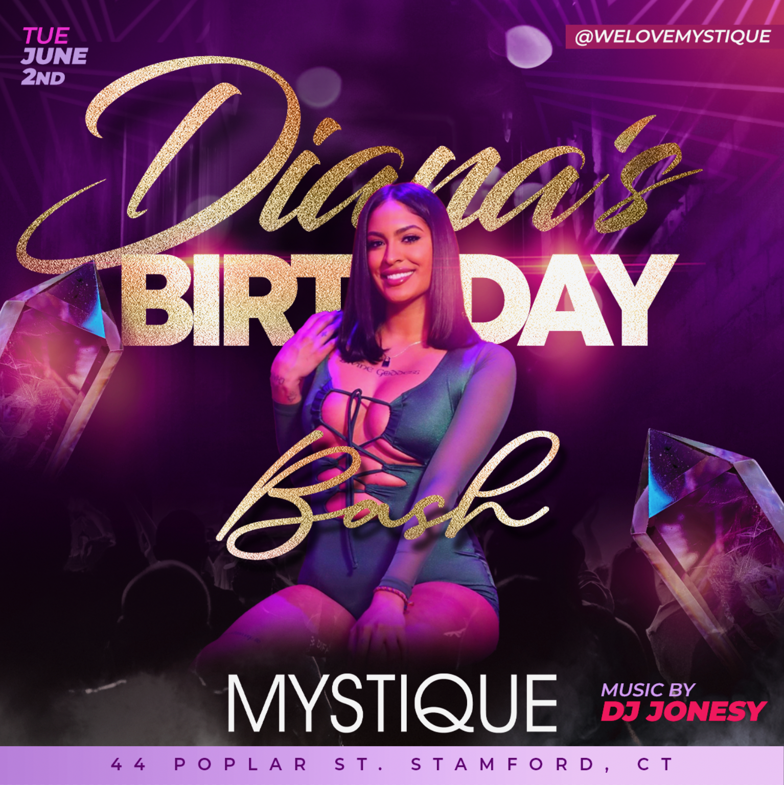 TUESDAY, JUNE 2ND MEET US @ MYSTIQUE STAMFORD FOR DIANA’S BIRTHDAY BASH! MUSIC BY YOURS TRULY BEGINS @ 9PM. HAPPY HOUR FROM 4PM-6PM. SEE YOU THERE!
