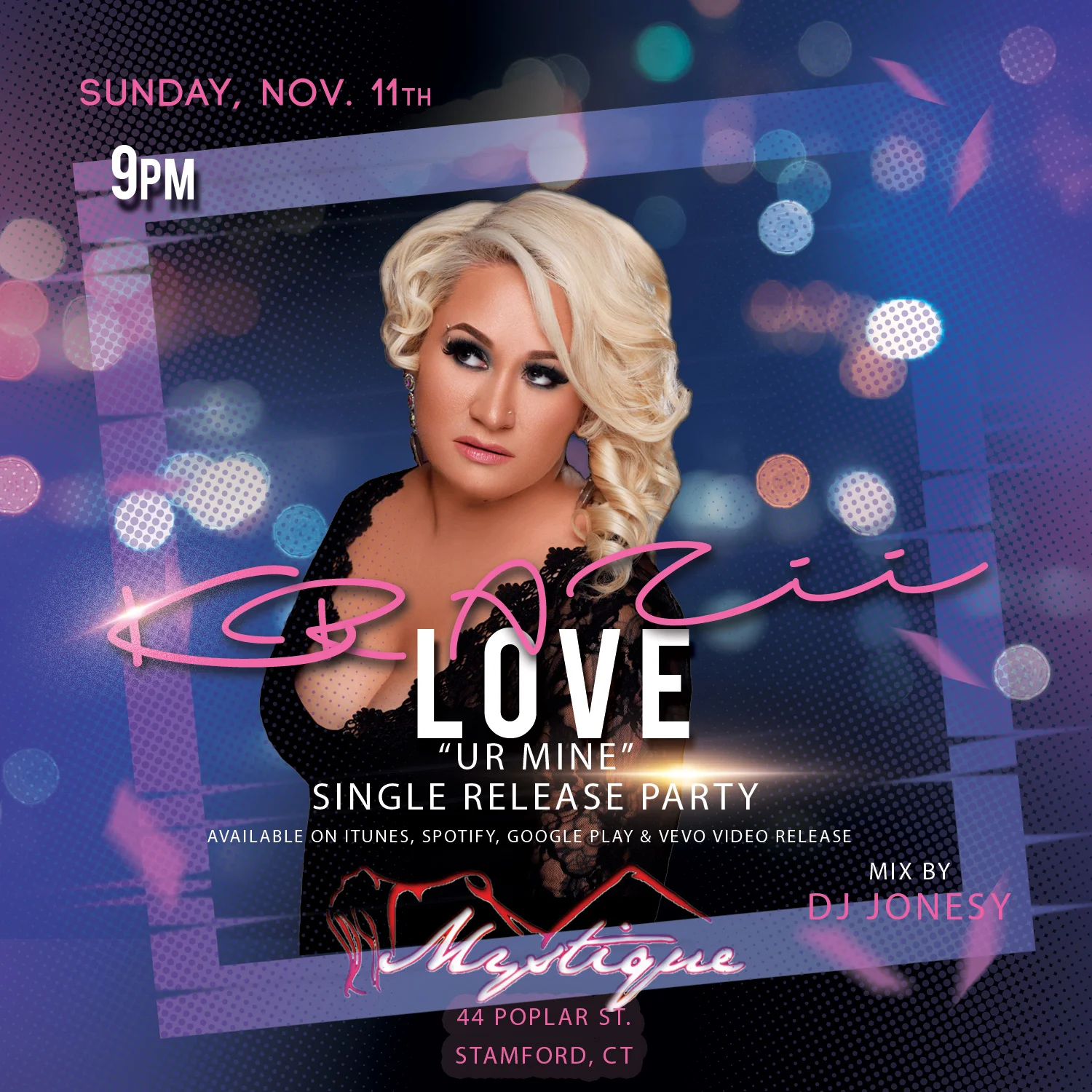 SUNDAY, NOVEMBER 11TH JOIN US AT MYSTIQUE STAMFORD FOR KRAZII LOVE’S - '“UR MINE” SINGLE RELEASE PARTY! MUSIC BY YOURS TRULY STARTS AT 8PM. KRAZII LOVE WILL BE IN THE BUILDING PERFORMING HER BRAND NEW SINGLE “UR MINE,” AS WELL AS, HER OTHER HITS! SEE EVERYONE THERE!